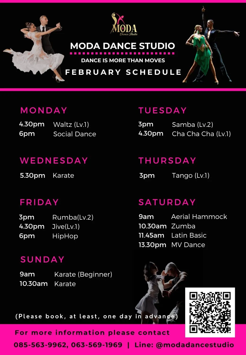 คุณสามารถเข้าร่วมคลาสเรียนเต้นแบบกลุ่มที่ ระยะเวลาแต่ละคลาสคือ 1 ชั่วโมง โดยคุณสามารถเลือกคลาสในตารางประจำเดือน และเราก็มีคลาสกลุ่มแบบส่วนตัวด้วยเช่นกัน นี่คือรายละเอียด:
